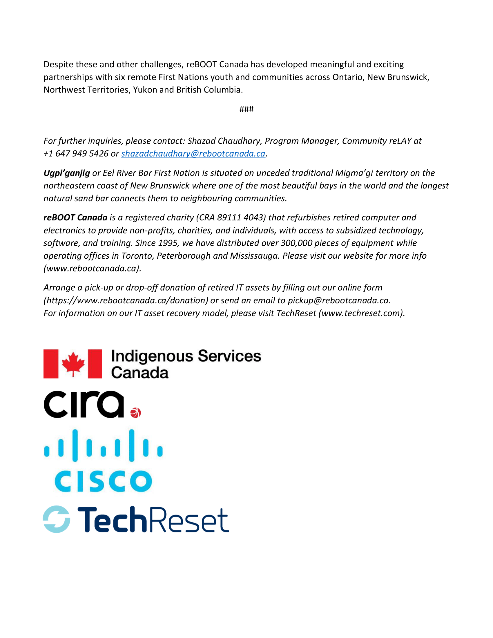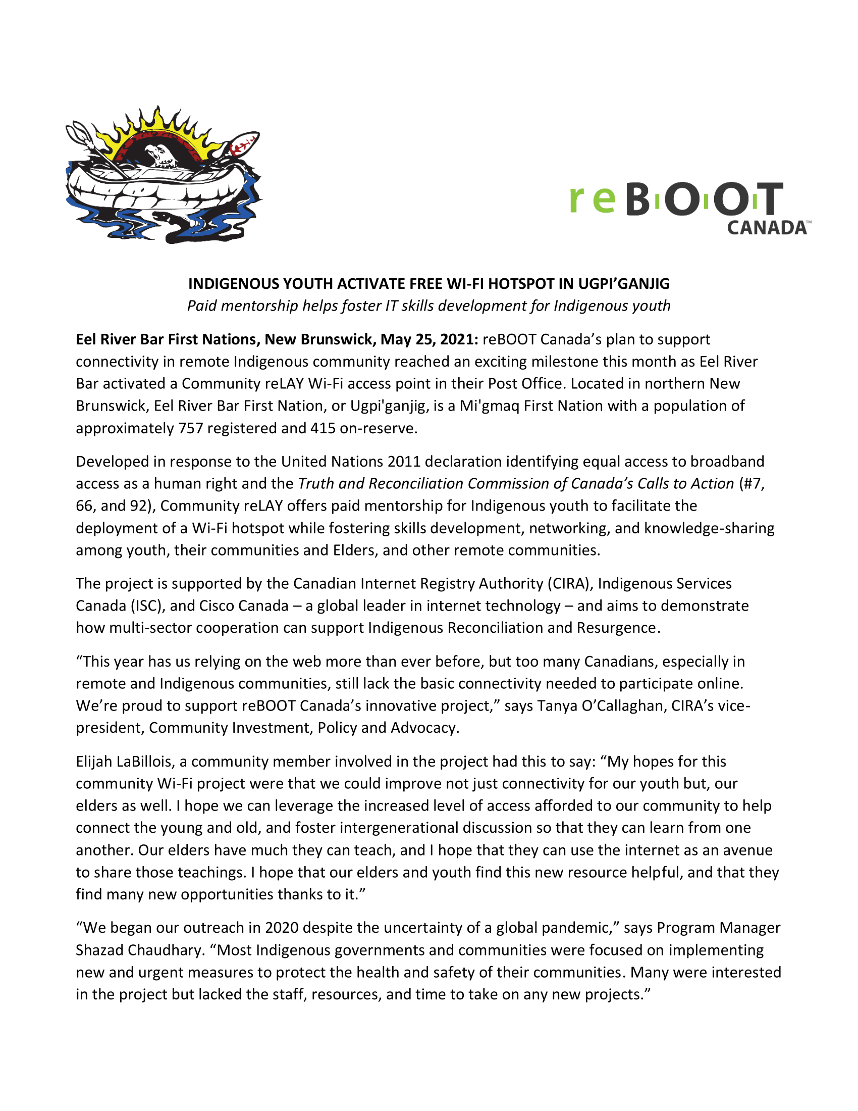 Eel River Bar is proud to launch, in association with Reboot Canada, our community wi-fi hotspot. Located at the community post office/fisheries building, it’s open to all community members. We would like to thank Indigenous Services Canada, CIRA, CISCO, TechReset and PLC info.