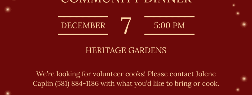 Join us for an evening of holiday cheer, great food, and community spirit at our annual Christmas Community Dinner! Everyone is welcome to come together and share in a festive meal surrounded by friends and family.