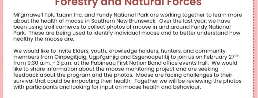 Community members are invited to attend a Moose Health Information Session being held at the Pabineau Band Office Event Hall.