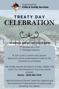 Join us for a community lobster feast and a short presentation made on the importance of treaties We kindly request donations of sides, salads, and buns. For contributions or inquiries, please contact: Nancy - (506) 684-0149 Special thanks to Daniel Caplin for organizing & the fishermen/ fisherwomen for generously donating the lobster.