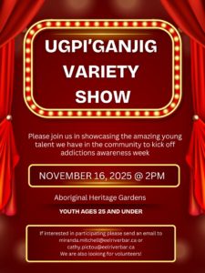 Please join us in showcasing the amazing young talent we have in the community to kick off addictions awareness week. Youth ages 25 and under. If you're interested in participating, please send an email to miranda.mitchell@eelriverbar.ca or cathy.pictou@eelriverbar.ca. We are also looking for volunteers!