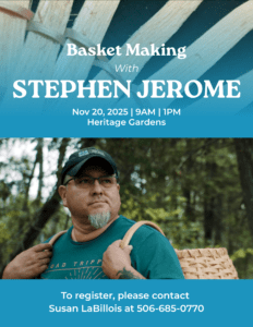 Basket Making with Stephen Jerome! Join us at the Heritage Gardens for a hands-on basket making workshop with Stephen Jerome. There will be two sessions:9:00 AM1:00 PM To register, please contact Susan LaBillois at 506-685-0770.Please note: Preference will be given to participants who have not taken the class before. Come learn, create, and connect!