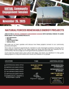 Join us for a virtual community engagement session with natural forces to learn more about the following projects:- Kci-Wocawson- Neweg- Paqt’smawei Sipu- Salmon River We invite you to hear updates and discuss how these projects connect to our community priorities and rights. This is also an important opportunity for members to ask meaningful questions, including […]