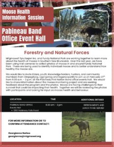 Moose Health Information Session Community members are invited to attend a Moose Health Information Session being held at the Pabineau Band Office Event Hall. This session will share information about a moose monitoring project in Southern New Brunswick, where trail cameras have been used to better understand moose health and behaviour. Participants will have the […]