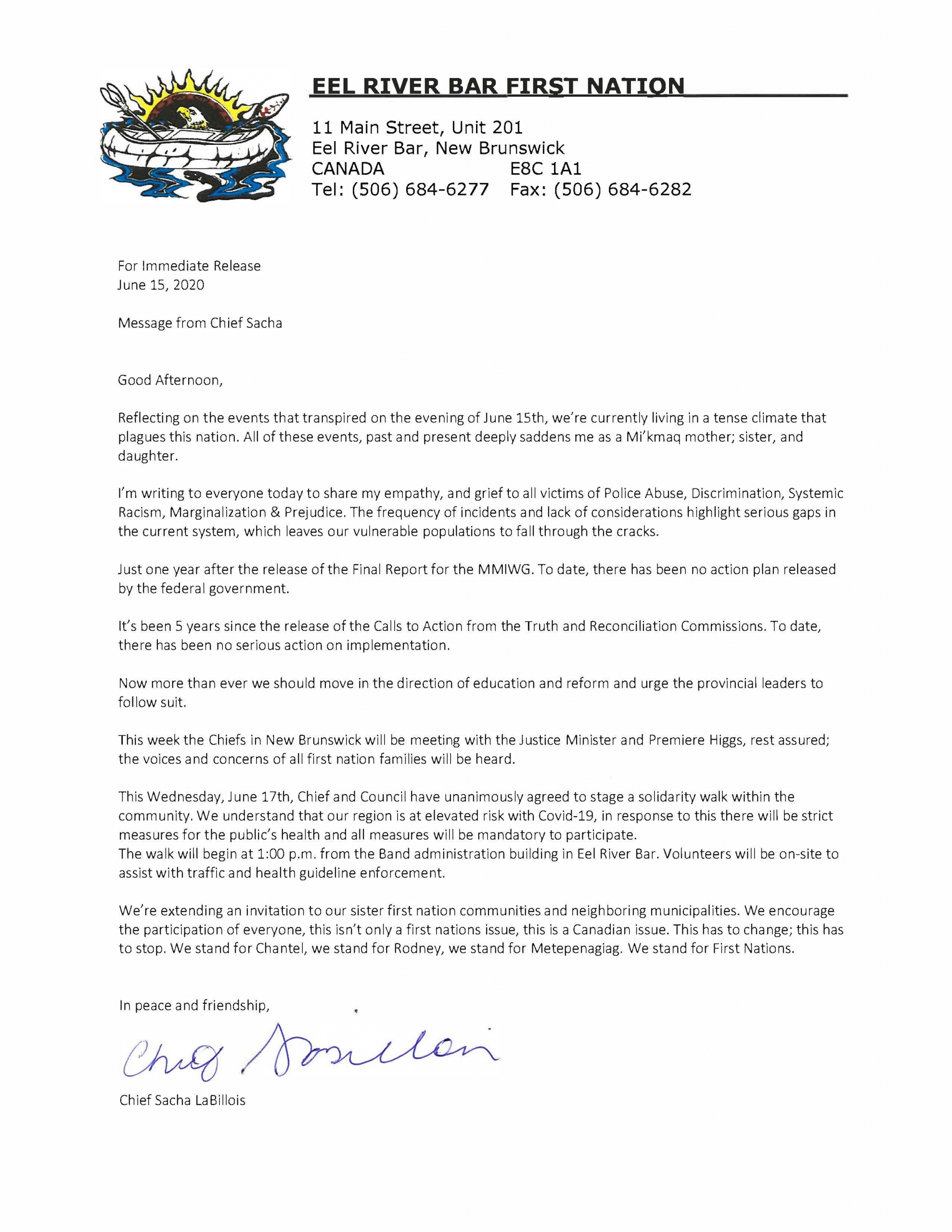 This Wednesday, June 17th, Chief and Council have unanimously agreed to stage a solidarity walk within the community. We understand that our region is at elevated risk with Covid-19, in response to this there will be strict measures for the public’s health and all measures will be mandatory to participate.