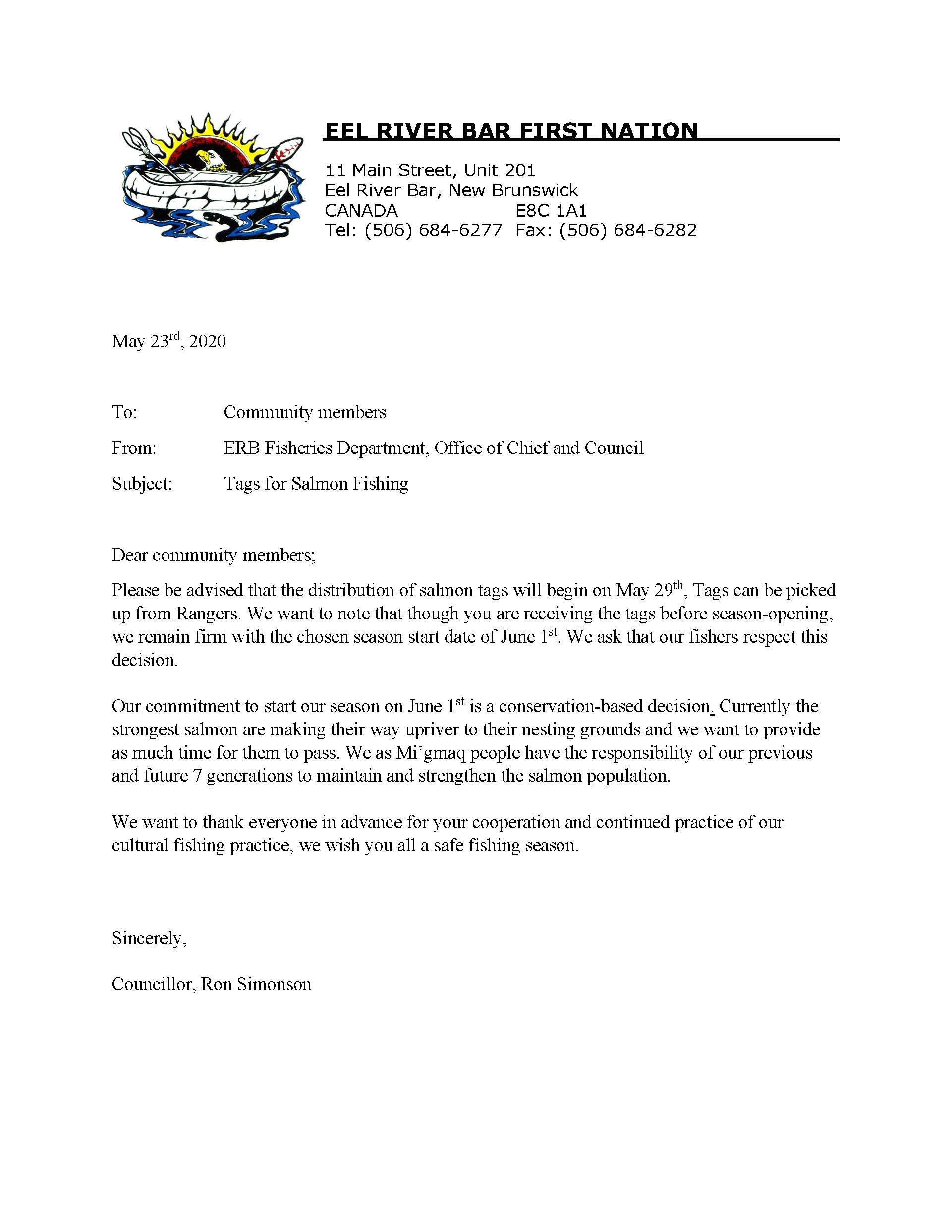 From:              ERB Fisheries Department, Office of Chief and Council