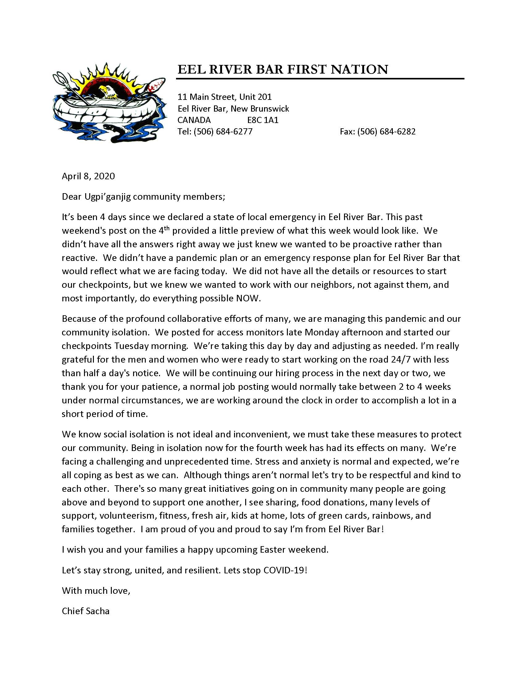 We know social isolation is not ideal and inconvenient, we must take these measures to protect our community. Being in isolation now for the fourth week has had its effects on many. We’re facing a challenging and unprecedented time. Stress and anxiety is normal and expected, we’re all coping as best as we can. Although things aren’t normal let’s try to be respectful and kind to each other. There’s so many great initiatives going on in community many people are going above and beyond to support one another, I see sharing, food donations, many levels of support, volunteerism, fitness, fresh air, kids at home, lots of green cards, rainbows, and families together. I am proud of you and proud to say I’m from Eel River Bar!