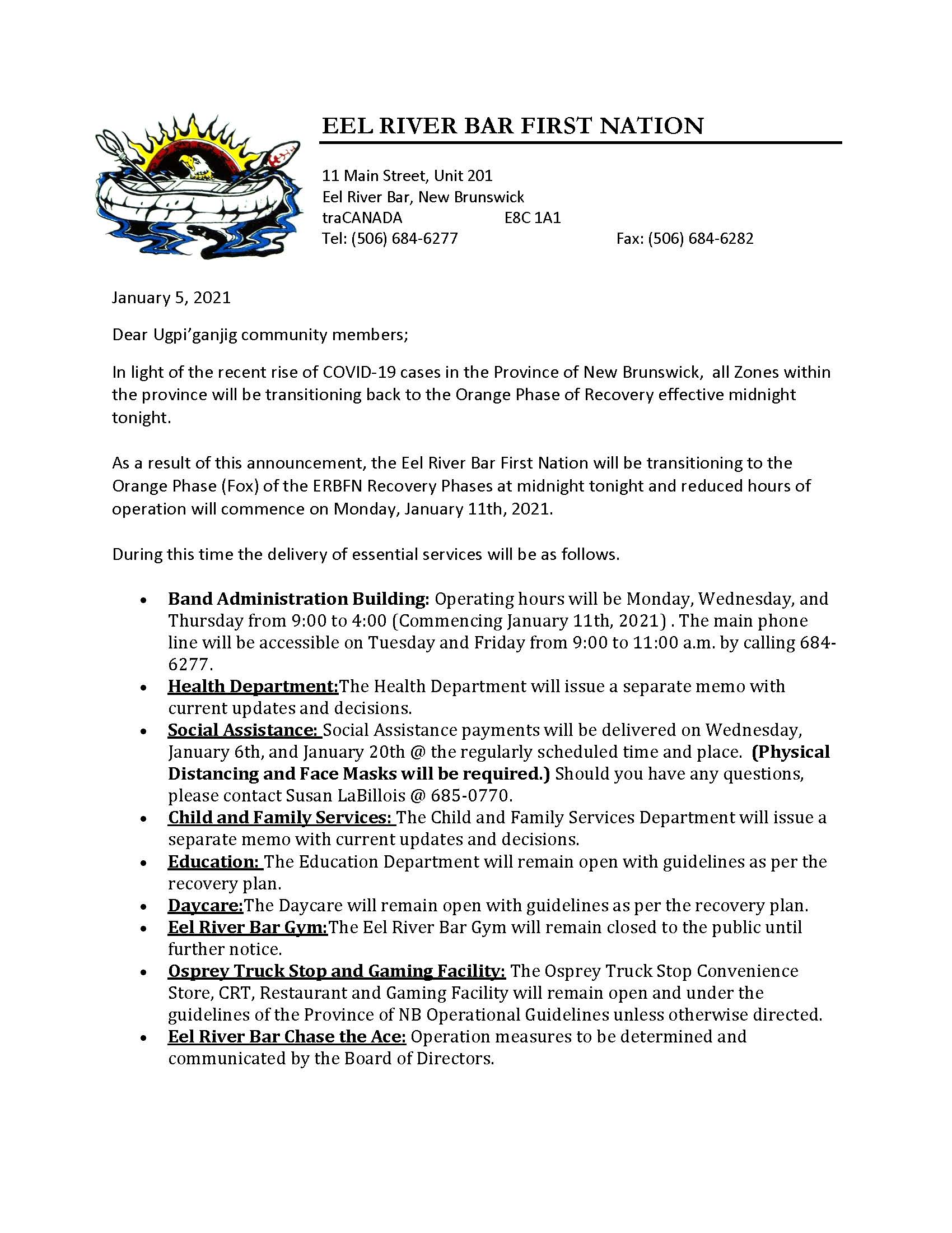 As a result of this announcement, the Eel River Bar First Nation will be transitioning to the Orange Phase (Fox) of the ERBFN Recovery Phases at midnight tonight and reduced hours of operation will commence on Monday, January 11th, 2021.