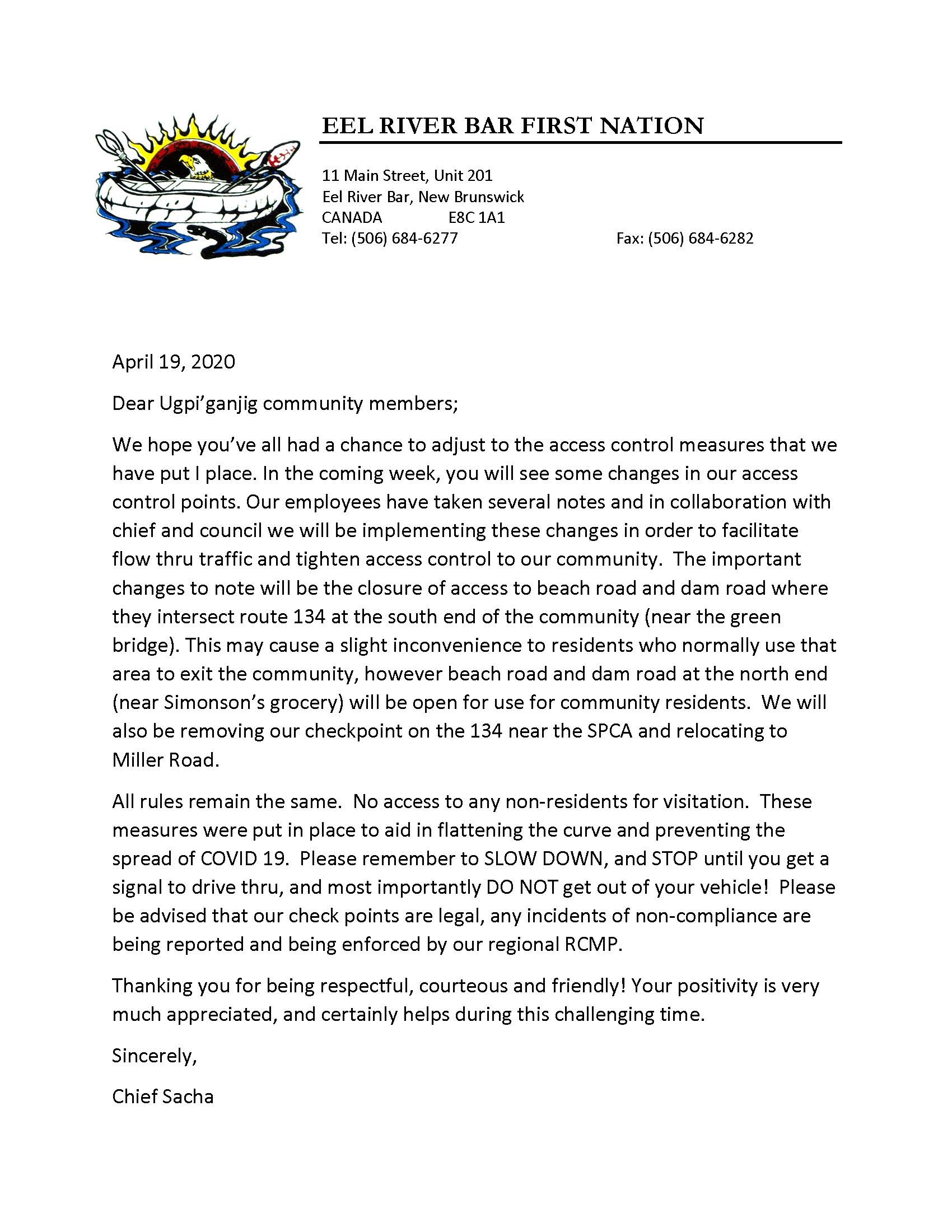 All rules remain the same. No access to any non-residents for visitation. These measures were put in place to aid in flattening the curve and preventing the spread of COVID 19. Please remember to SLOW DOWN, and STOP until you get a signal to drive thru, and most importantly DO NOT get out of your vehicle! Please be advised that our check points are legal, any incidents of non-compliance are being reported and being enforced by our regional RCMP.