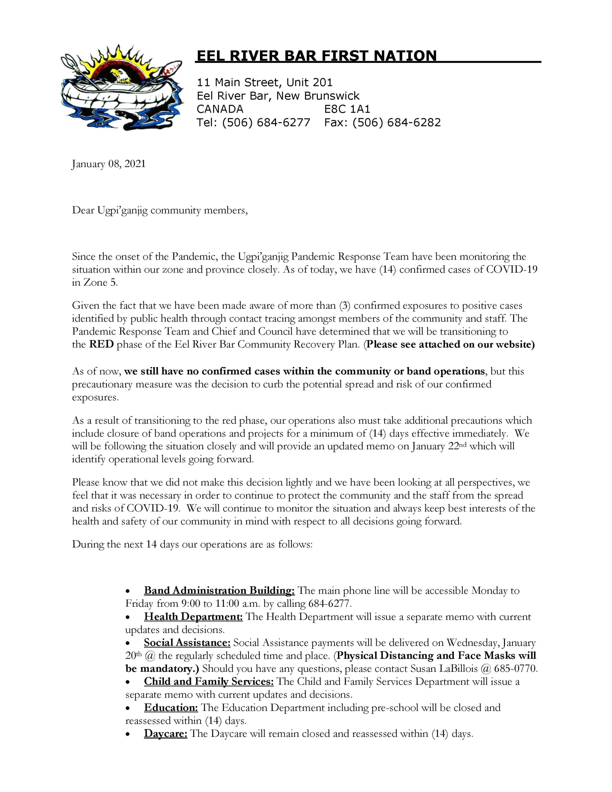 Given the fact that we have been made aware of more than (3) confirmed exposures to positive cases identified by public health through contact tracing amongst members of the community and staff. The Pandemic Response Team and Chief and Council have determined that we will be transitioning to the RED phase of the Eel River Bar Community Recovery Plan. (Please see attached on our website)