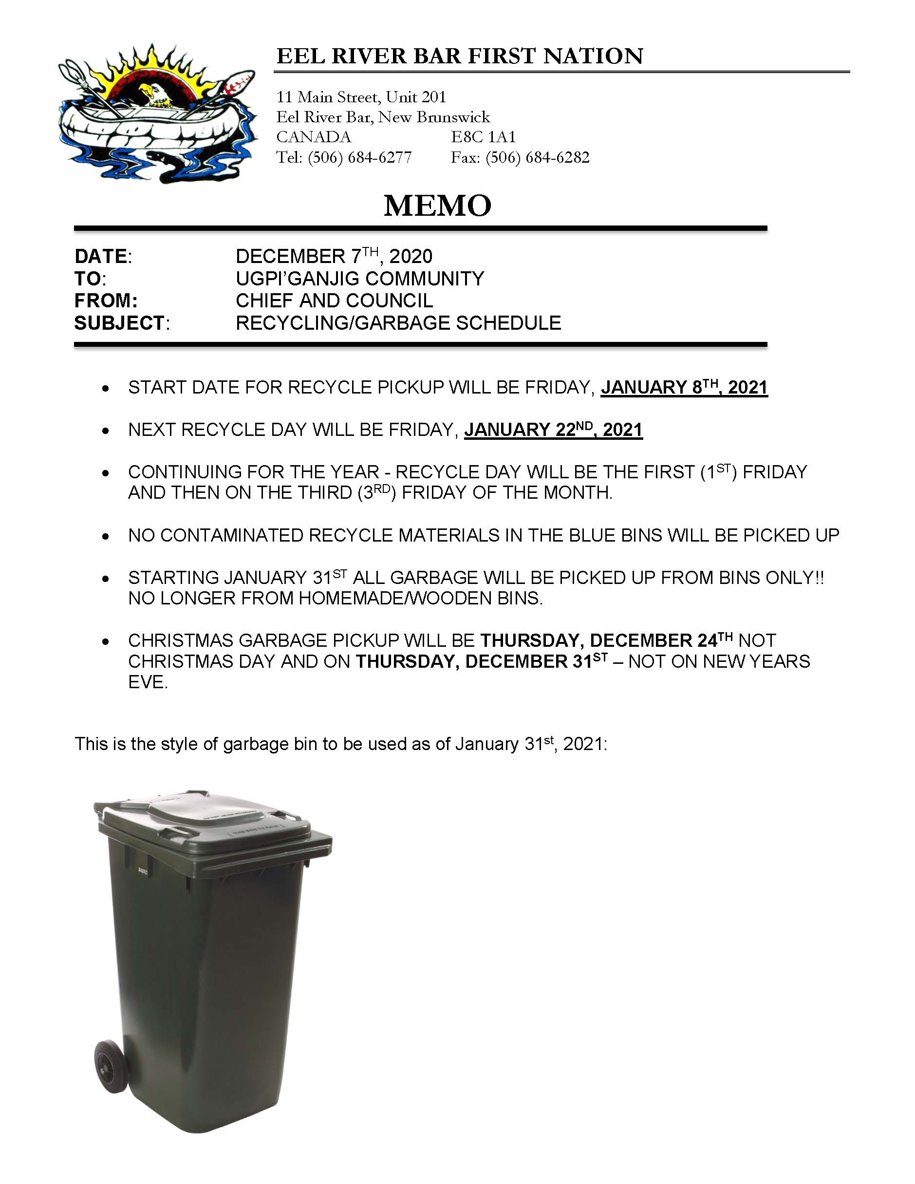 SUBJECT: RECYCLING/GARBAGE SCHEDULE