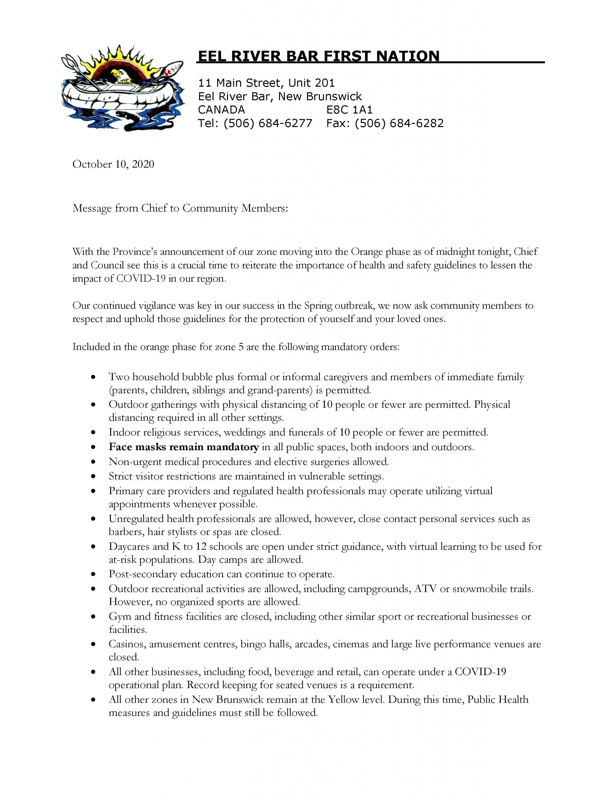 Update from Chief and Council regarding Zone 5 transition to Orange Phase.