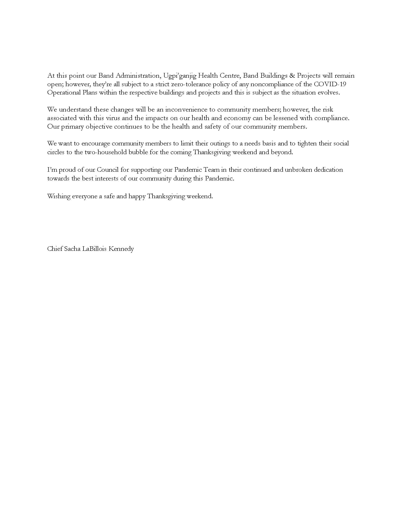 At this point our Band Administration, Ugpi’ganjig Health Centre, Band Buildings & Projects will remain open; however, they’re all subject to a strict zero-tolerance policy of any noncompliance of the COVID-19 Operational Plans within the respective buildings and projects and this is subject as the situation evolves.