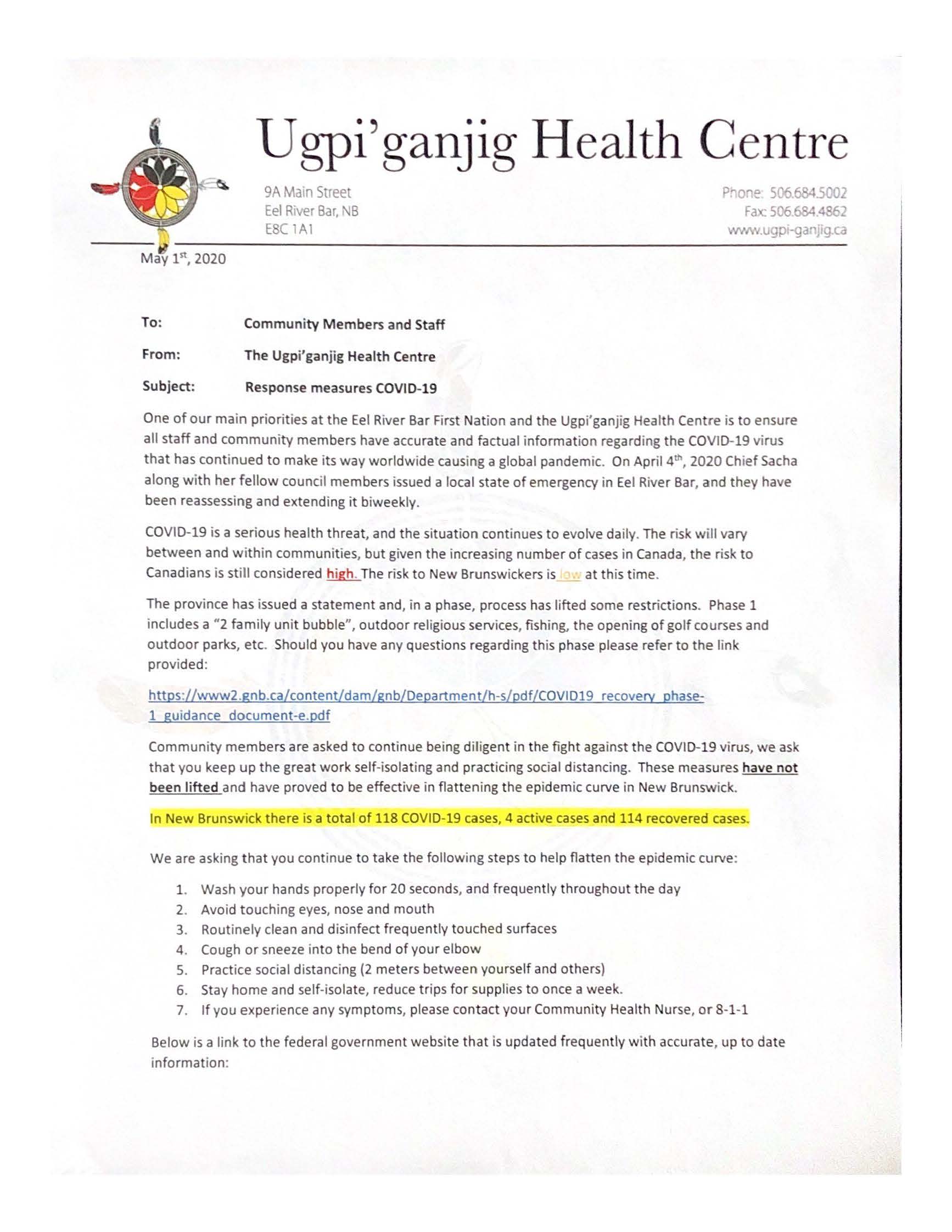 Update from the Ugpi’ganjig Health Centre regarding Additional Response Measures.