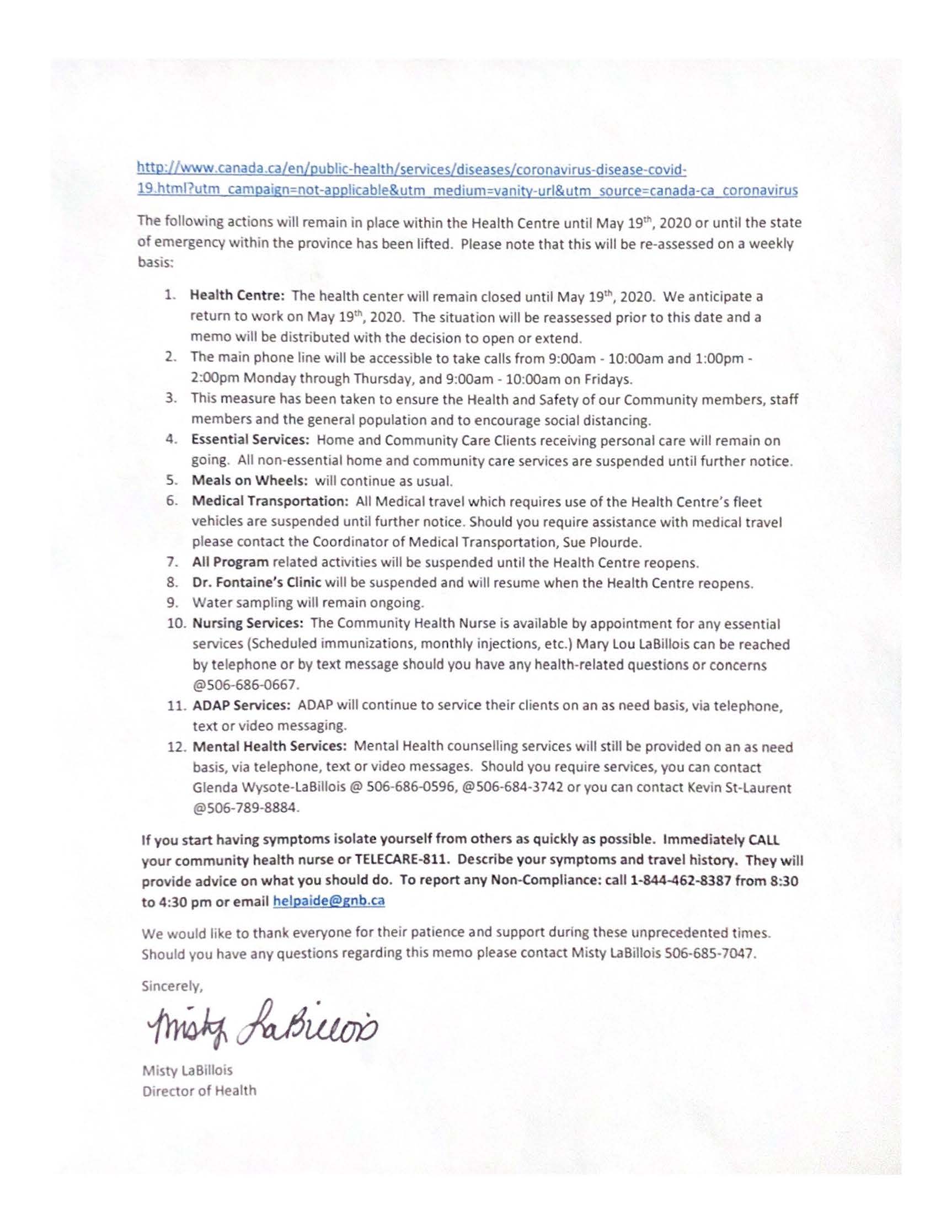 - Mental Health Services: Mental Health counselling services will still be provided on an as need basis, via telephone, text or video messages. Should you require services, you can contact Glenda Wysote-LaBillois @ 506-686-0596, @506-684-3742 or you can contact Kevin St-Laurent @506-789-8884.