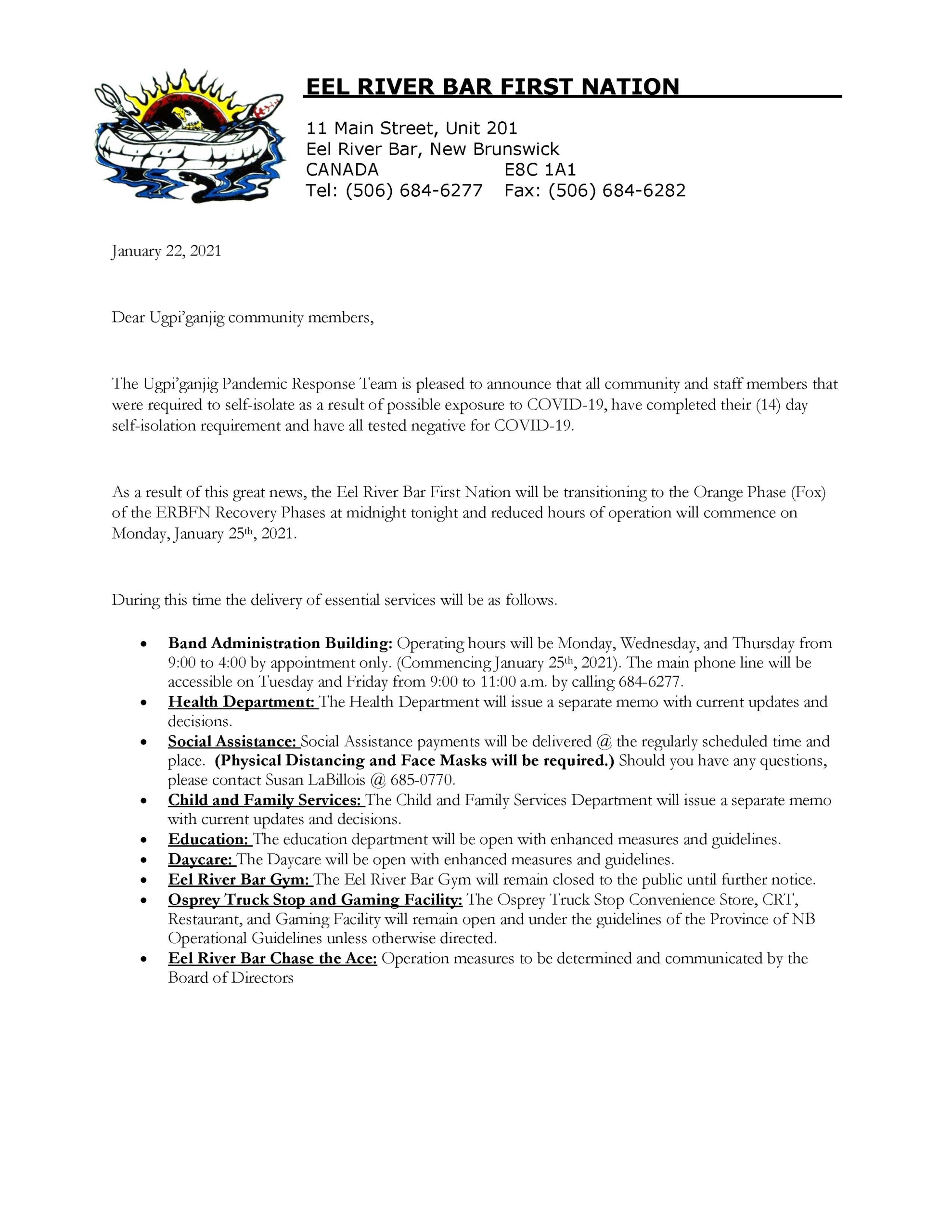 As a result of this great news, the Eel River Bar First Nation will be transitioning to the Orange Phase (Fox) of the ERBFN Recovery Phases at midnight tonight and reduced hours of operation will commence on Monday, January 25th, 2021.