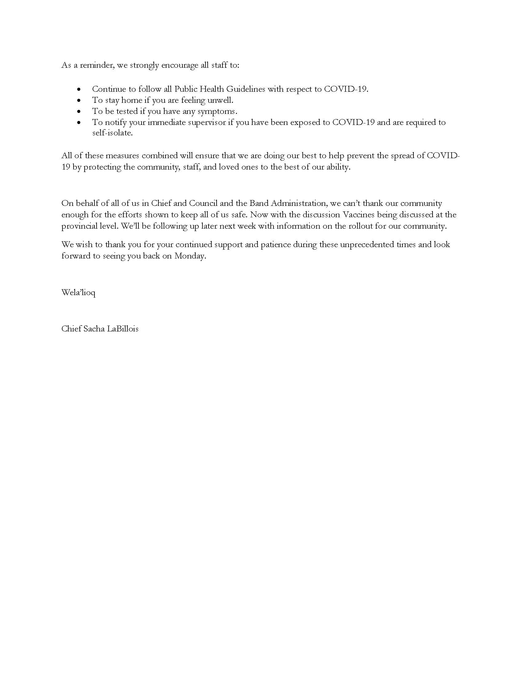 On behalf of all of us in Chief and Council and the Band Administration, we can’t thank our community enough for the efforts shown to keep all of us safe. Now with the discussion Vaccines being discussed at the provincial level. We’ll be following up later next week with information on the rollout for our community.