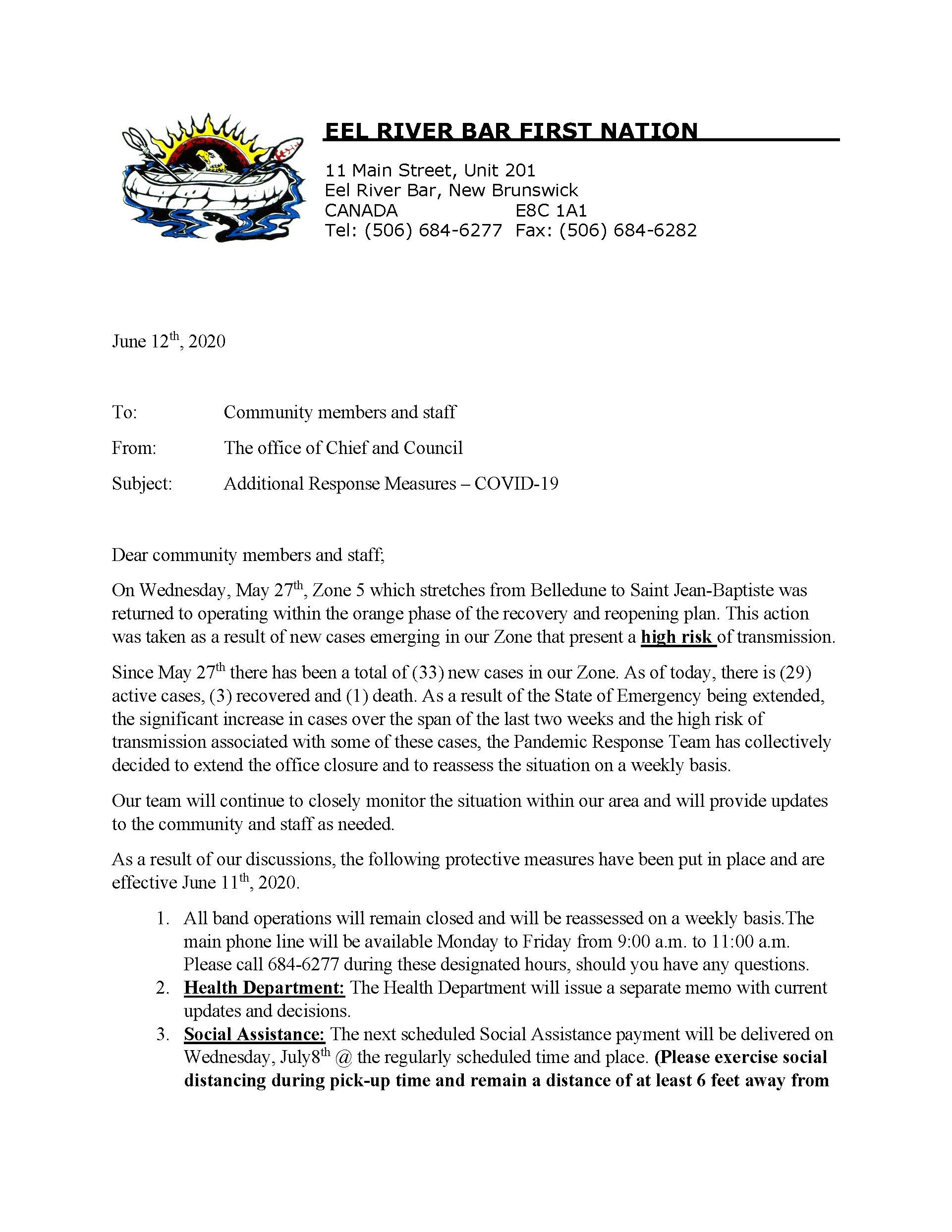 3. Social Assistance: The next scheduled Social Assistance payment will be delivered on Wednesday, July 8th @ the regularly scheduled time and place. (Please exercise social distancing during pick-up time and remain a distance of at least 6 feet away from