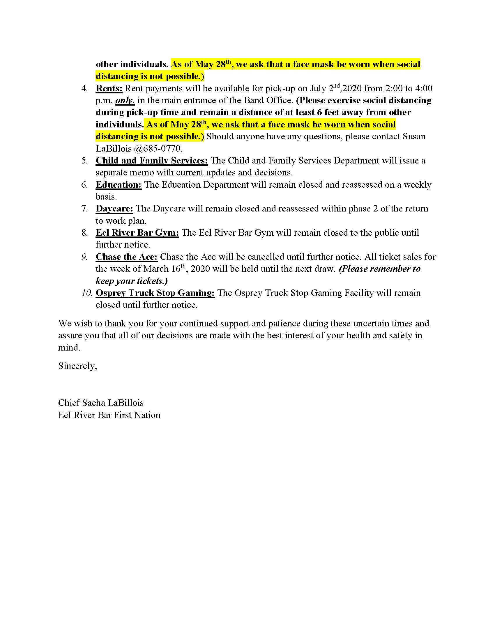 other individuals. As of May 28th, we ask that a face mask be worn when social distancing is not possible.) 4. Rents: Rent payments will be available for pick-up on July 2nd,2020 from 2:00 to 4:00 p.m. only, in the main entrance of the Band Office. (Please exercise social distancing during pick-up time and remain a distance of at least 6 feet away from other individuals. As of May 28th, we ask that a face mask be worn when social distancing is not possible.) Should anyone have any questions, please contact Susan LaBillois @685-0770.