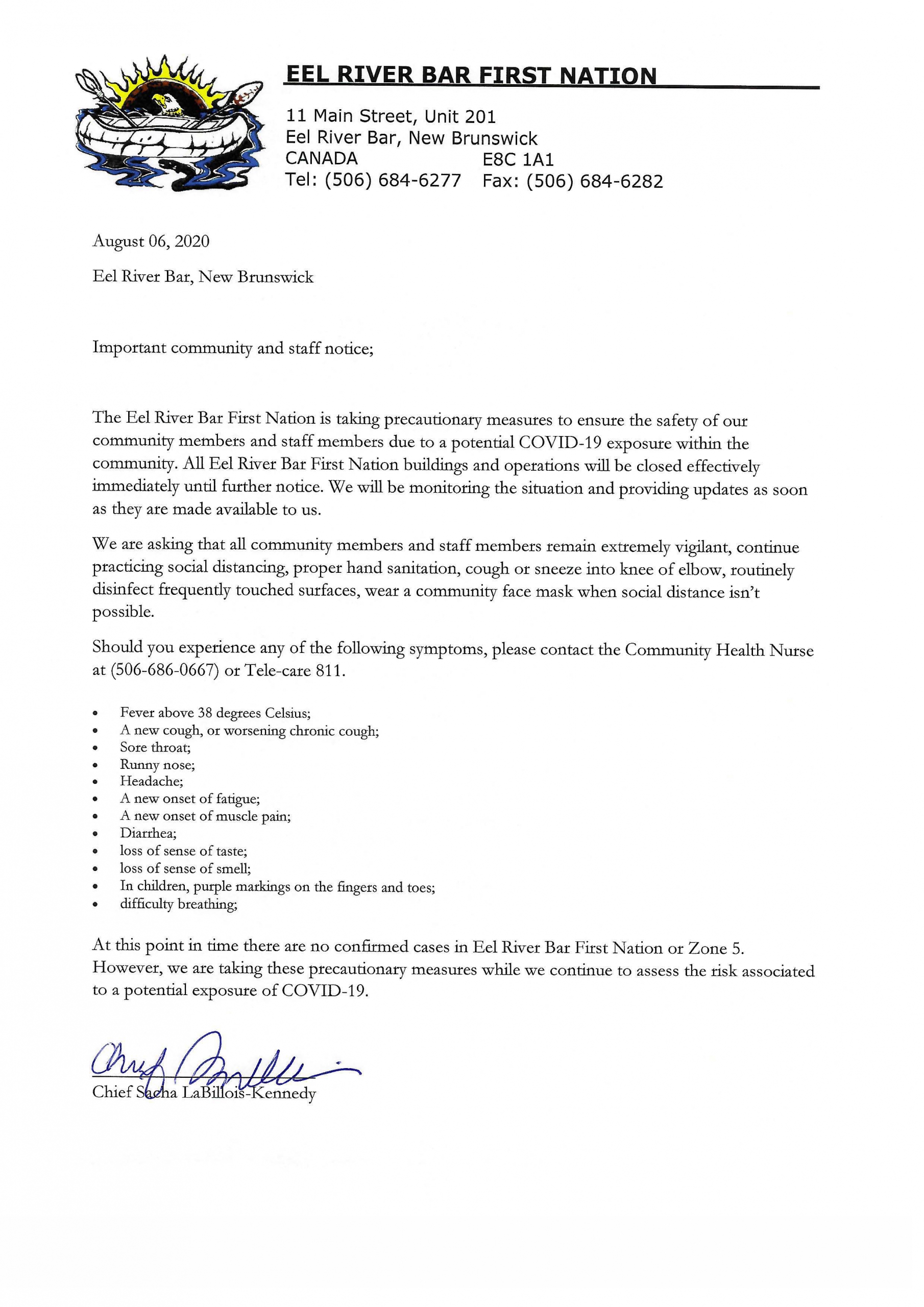 The Eel River Bar First Nation is taking precautionary measures to ensure the safety of our community members and staff members due to a potential COVID-19 exposure within the community. All Eel River Bar First Nation buildings and operations will be closed effectively immediately until further notice. We will be monitoring the situation and providing updates as soon as they are made available to us.
